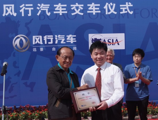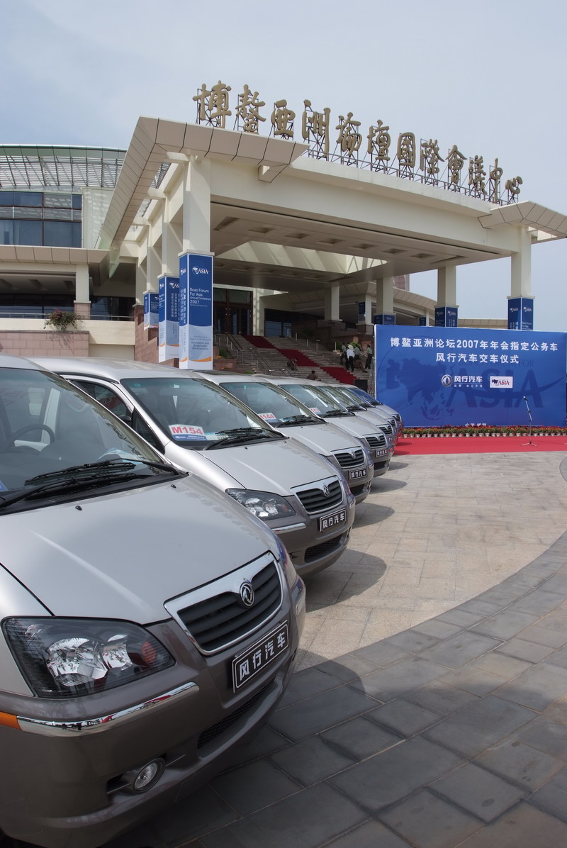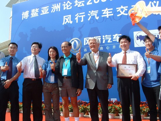 4月18日下午,在风景如画的海南博鳌,“博鳌亚洲论坛2007年年会指定公务车——风行汽车交车仪式”如期举行,已经81岁高龄的博鳌亚洲论坛理事长、菲律宾前总统拉莫斯先生,以及78岁高龄的博鳌亚洲论坛理事、澳大利亚前总理霍克先生应邀一起出席了这次交车仪式,这使本次活动成为了风行MPV与总统、总理级贵宾的首次会面。此外,博鳌亚洲论坛秘书长、中国入世首席谈判代表龙永图先生,以及东风柳州汽车有限公司副总经理杨振球先生、东风柳州汽车有限公司总经理特别助理覃政先生也一同出席了仪式。